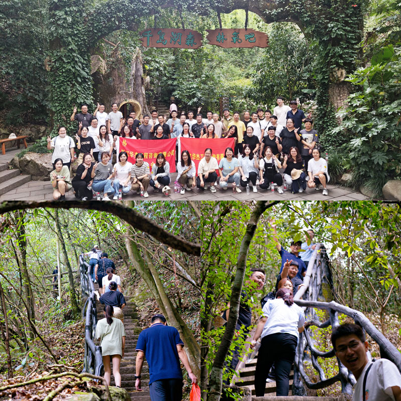 第二天上午大家来到了千岛湖森林氧吧景区,山间的空气格外新鲜,大家都忍不住多吸一口新鲜空气。上山时大家竞逐而行、互相鼓励,下山时左顾右盼、你搀我扶,时时刻刻体现着华杰大家庭的团结、友爱,出了一身汗后大家变得格外的神清气爽。